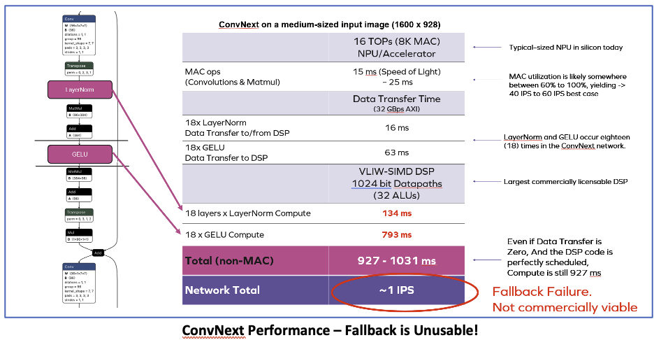 Our analysis of ConvNext on an NPU+DSP architecture suggests a throughput of less than 1 inference per second. Note that these numbers for the fallback solution assume perfect 100% utilization of all the available ALUs in an extremely wide 1024-bit VLIW DSP. Reality would undoubtably be below the speed-of-light 100% mark, and the FPS would suffer even more. In short, Fallback is unusable. Far from being a futureproof safety net, the DSP or CPU fallback mechanism is a death-trap for your SoC.