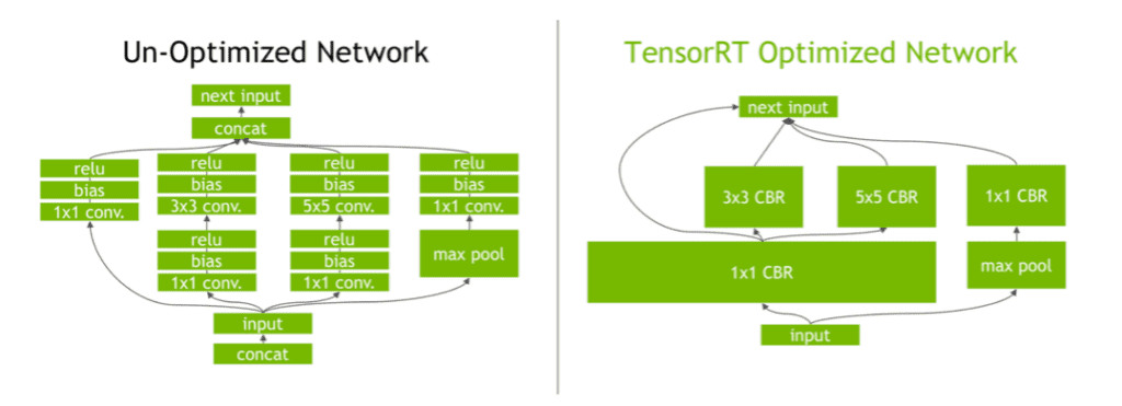 Figure 2. A GoogLeNet Inception module network before and after layer fusion performed by NVIDIA’s TensorRT™ Optimizer. Original image available in this blog post by NVIDIA.