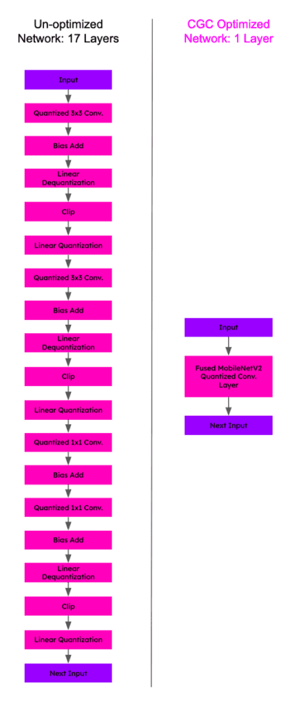 Figure 11. A MobileNetV2 module network before and after layer operator fusion performed by Quadric’s Chimera™ Graph Compiler (CGC).