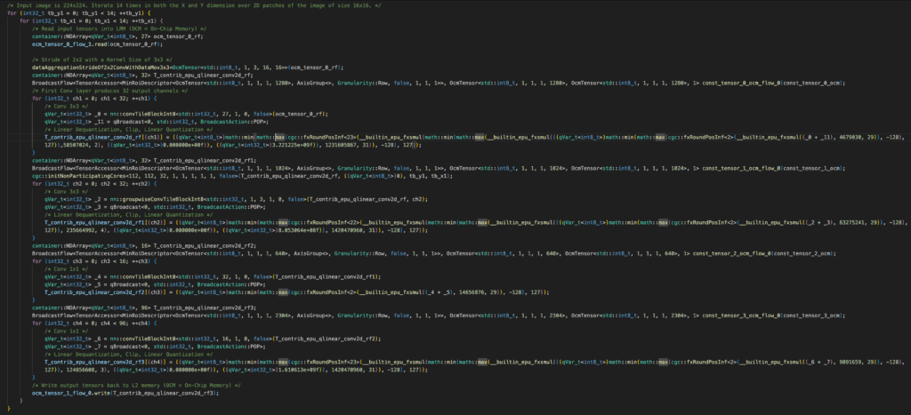 Since the PEs are collectively programmed with a single instruction stream, the APIs available to represent these operators are remarkably simple which can result in very short, but performant code. Below is the auto-generated C++ code-snippet for the MobileNetV2 operators from Figure 10 generated by Quadric’s CGC. Without comments, which have been added, it is 37 lines of code for all 17 operators: