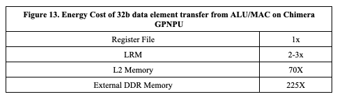 For high-performance edge applications that are optimizing performance for TOPS/W, these data movement savings translate directly to power savings. Below in Figure 13 is a table of the relative costs associated with moving a 32b data element from the ALU/MAC engine register file memory on a Chimera GPNPU to each of the other levels of memory: