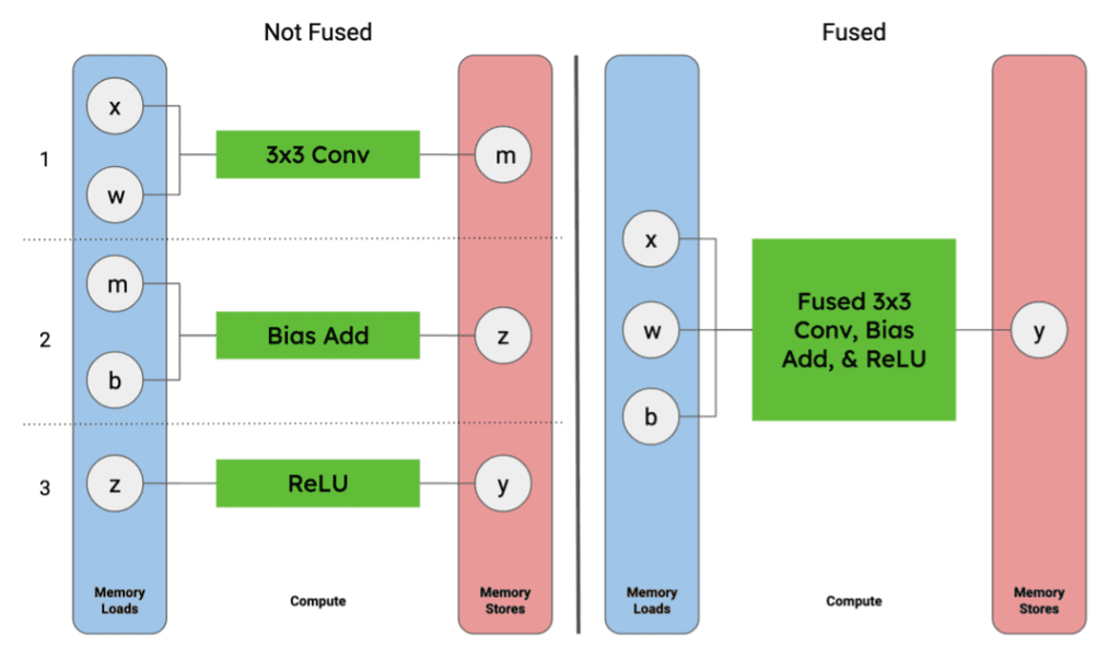 Fusing convolutional layers, bias adds, and activation function layers, like NVIDIA’s TensorRT tool did in Figure 2, is an extremely common choice for operator fusion. Convolutions and activation functions can be decomposed into a series of matrix multiplication operations followed by element-wise operations that look something like: