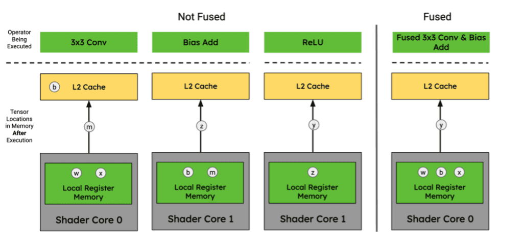 Operator fusion intuitively optimizes AI programs in a similar way, but the performance benefits are measured in fewer memory read/writes which results in fewer clock cycles dedicated to program overhead which generates a more efficient program binary.