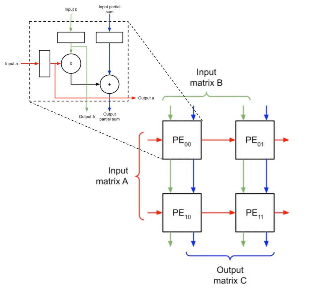 Figure 7. Diagram of a systolic array for MAC operations. Original image adapted from two images in this blog post.