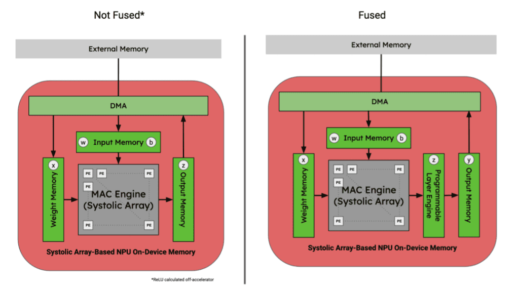 The most performant NPU’s are designed with operator fusion in mind for a limited set of permutations of operators. Since they are hard-wired and therefore cannot be programmed, they cannot handle memory reshaping or reorganization or even fuse some activation functions that aren’t handled by their coupled hardware blocks. To perform these operations, the programs must write back out to some shared memory: either on device or shared memory on the SoC.